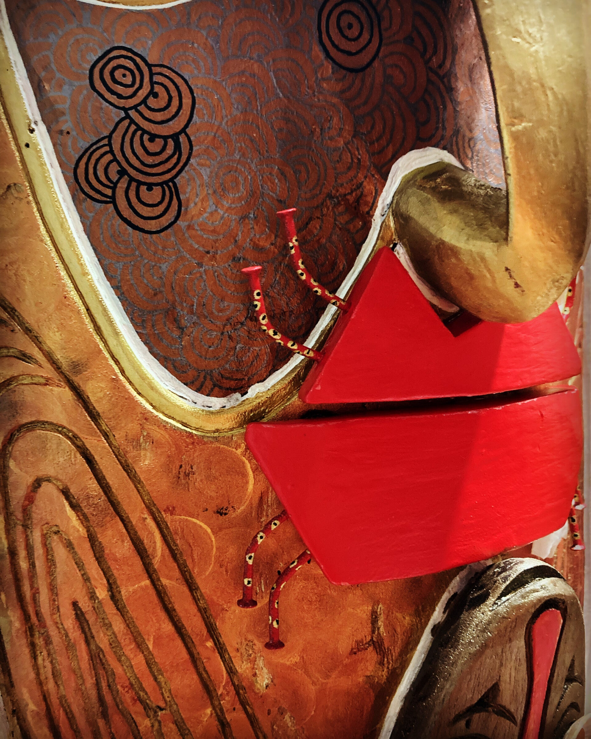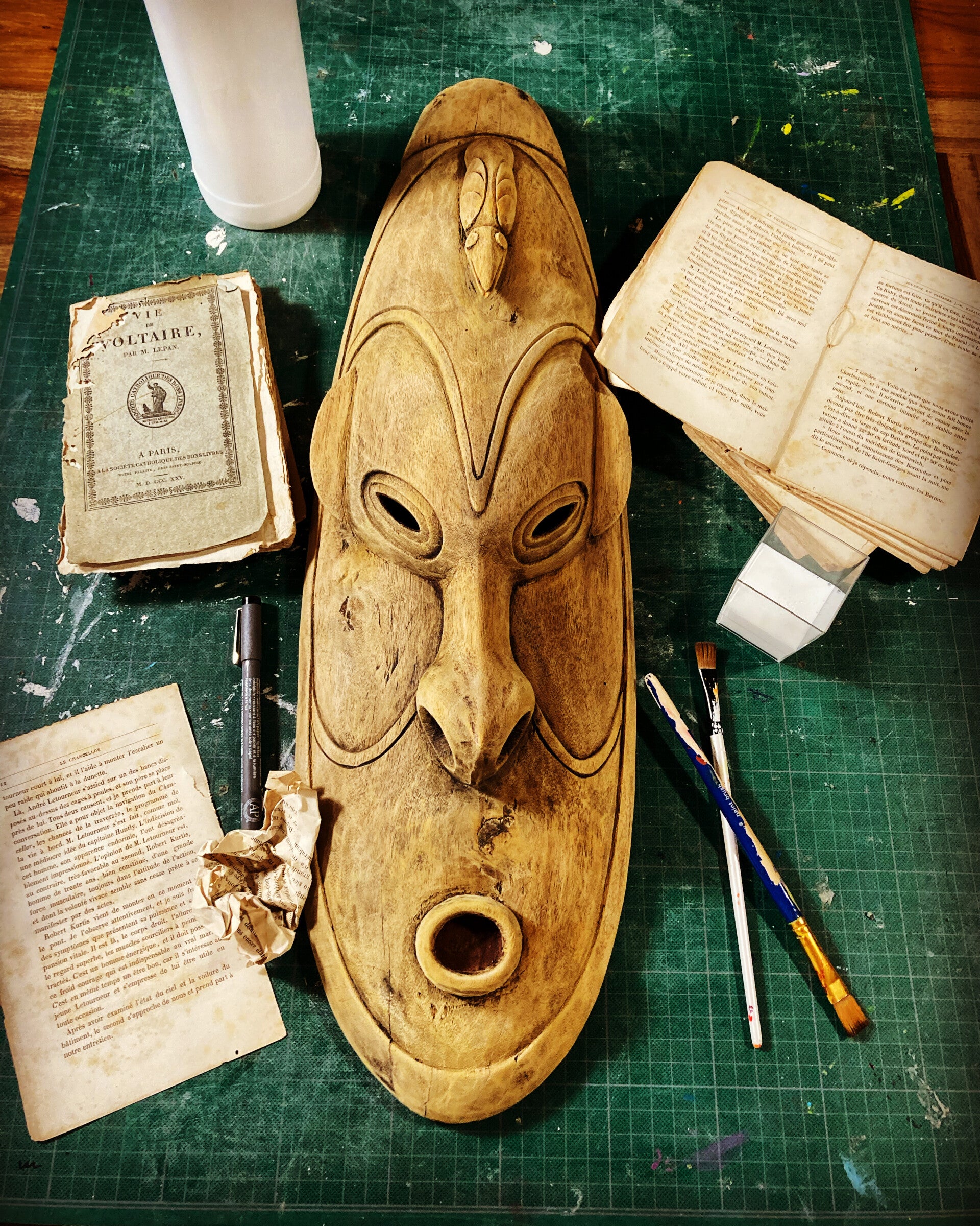 À travers ce masque, j’ai voulu fusionner l’esprit ancestral de l’art premier papou avec la grâce et la légèreté de cet oiseau local, dans un travail minutieux de détail, de couleur et de respect de la matière.