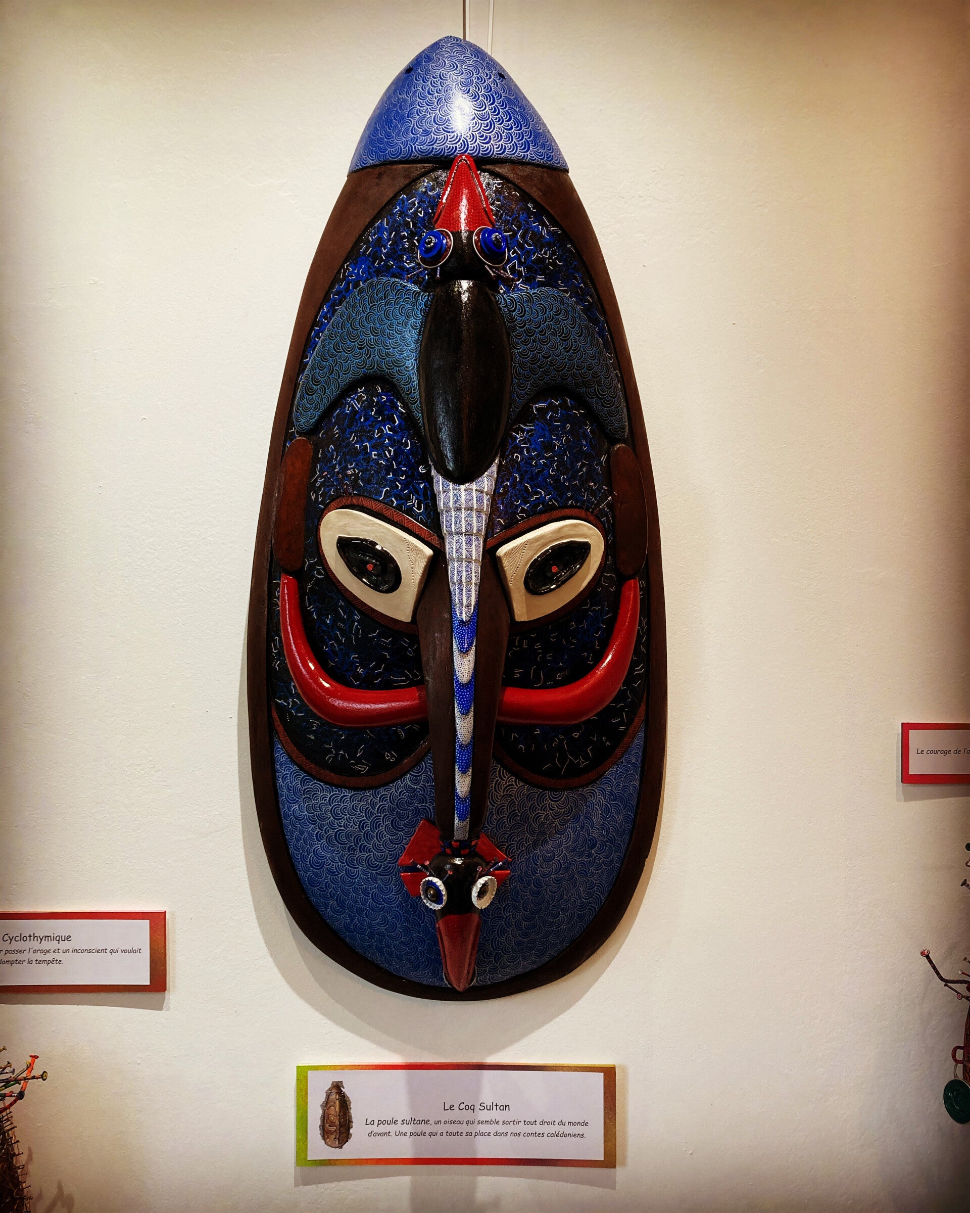 Ce masque rend hommage à cet oiseau discret mais majestueux que l’on rencontre souvent au bord des mangroves calédoniennes. On l’appelle poule sultane pour sa silhouette élégante et son cri nocturne si particulier.