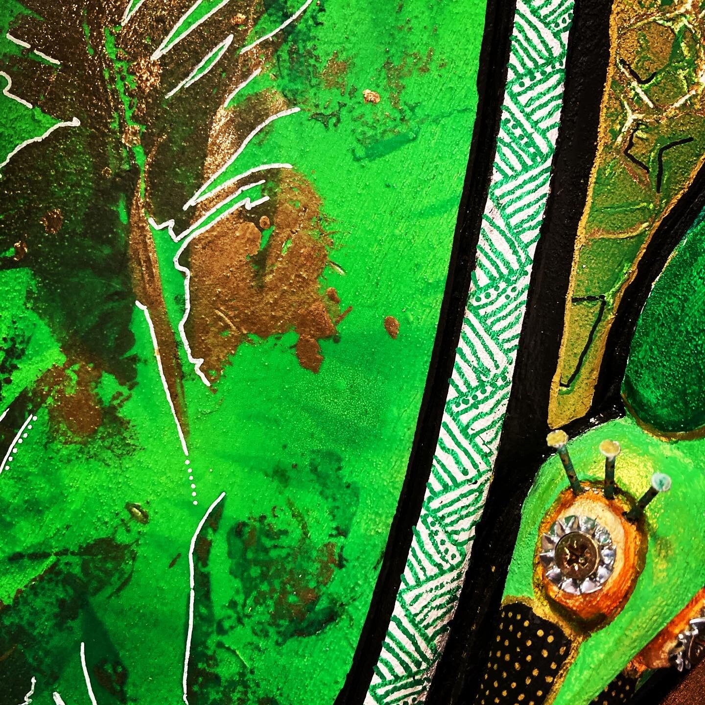 J’y mêle graffiti et acrylique, encres de Chine et graphismes très fins. Les clous, peints un à un, apportent une pointe de fantaisie et d’énergie. Les yeux en céramique, brillants et vivants, aimantent le regard.